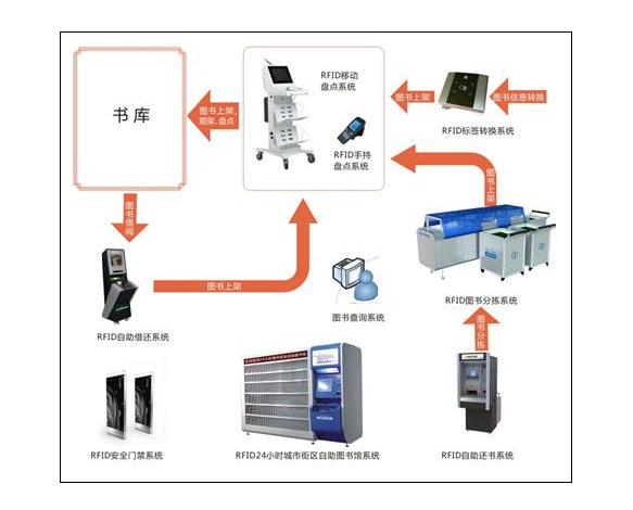 RFID book management system including tag trans system, self-help borrow system, self-help return system, smart searching system, push-car inventory system, safe gate checking system.