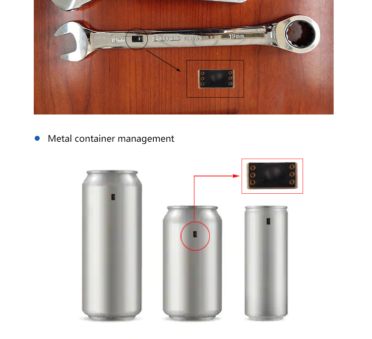 This UHF RFID Tool Anti-metal Tag is an application of special tag and placed on the side of the cylindrical metal objects.